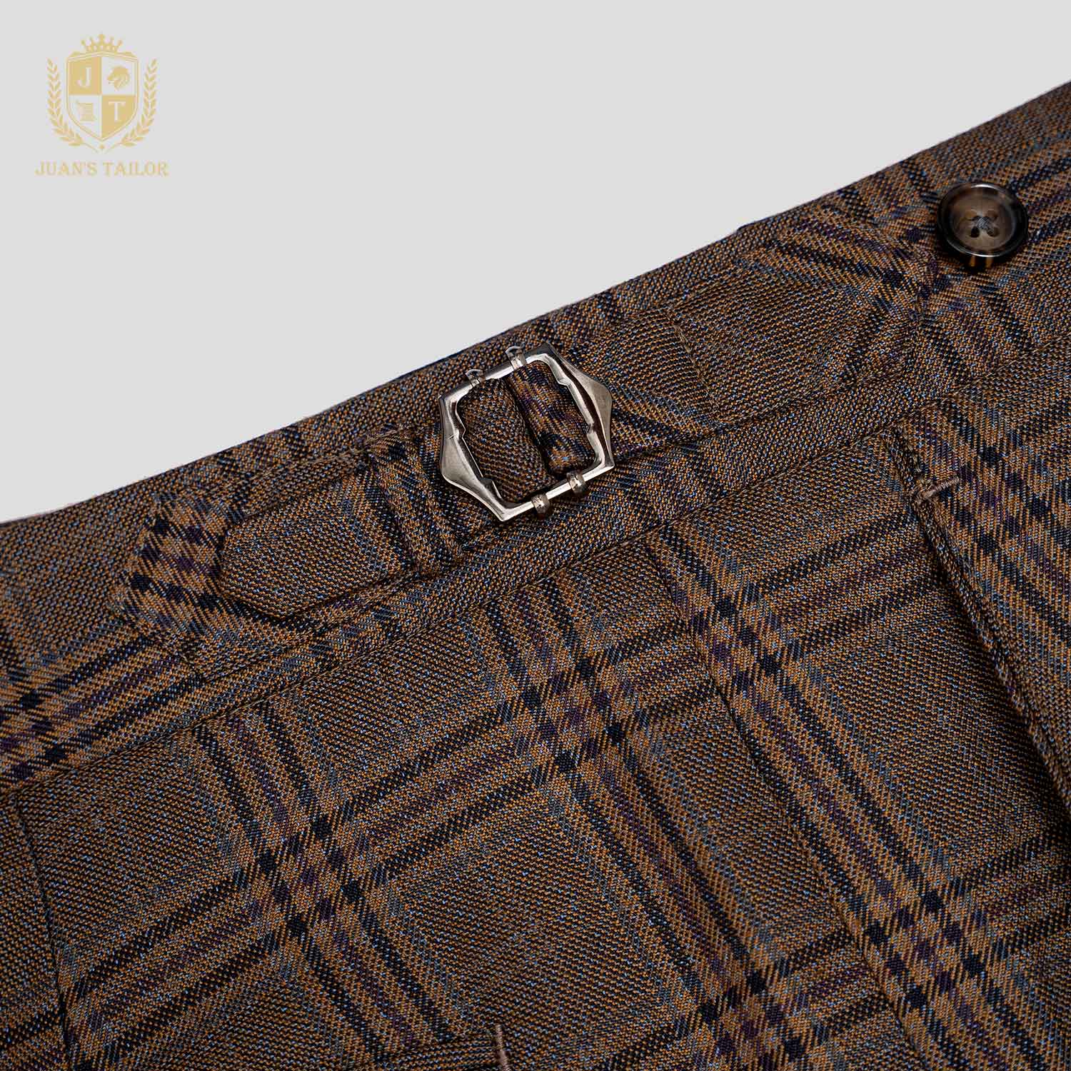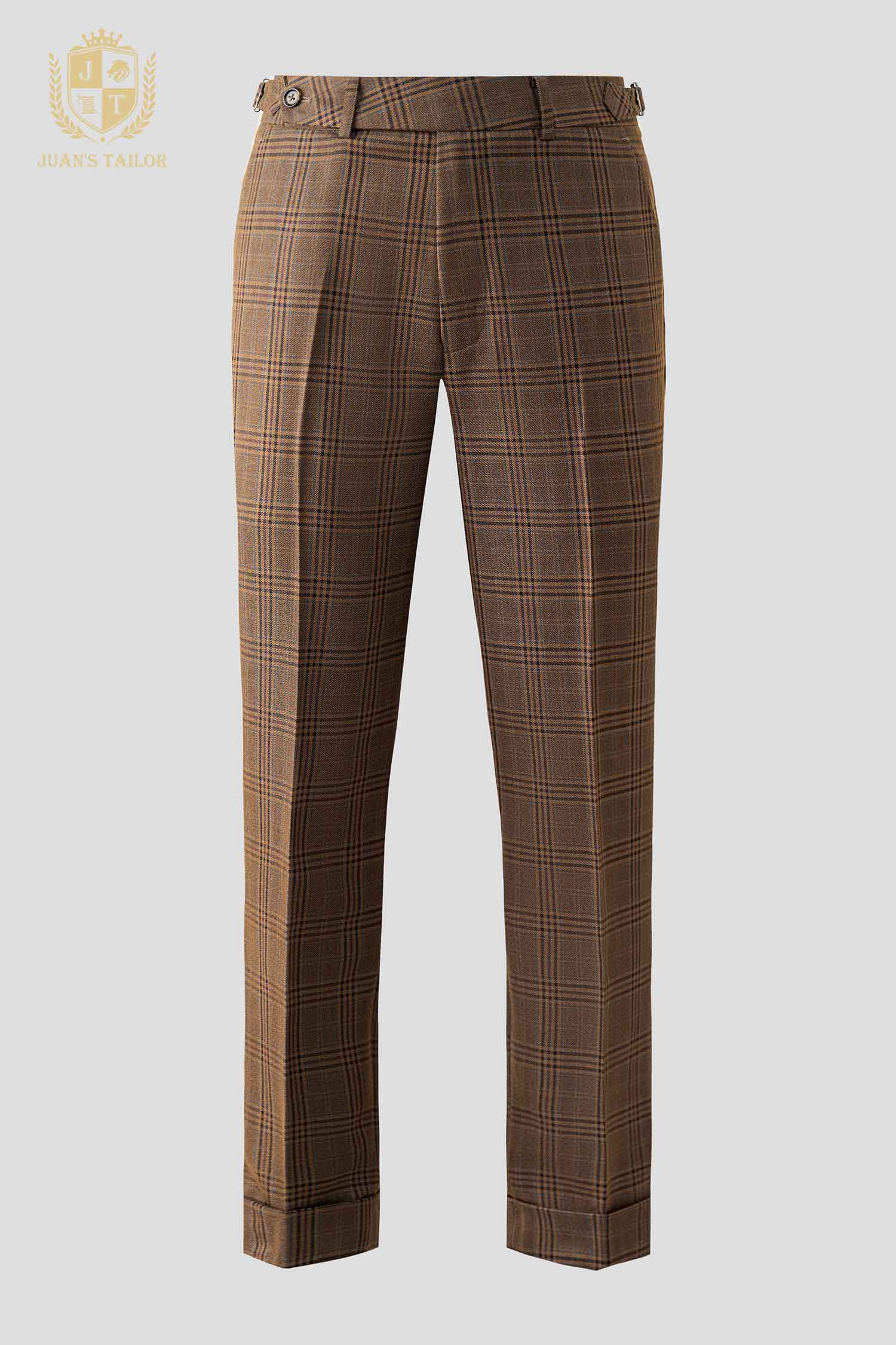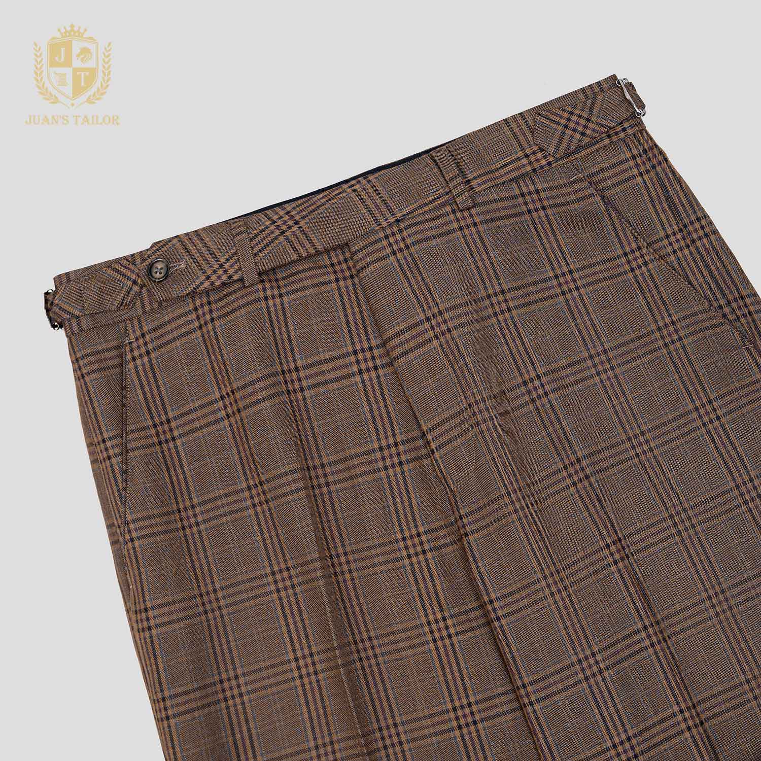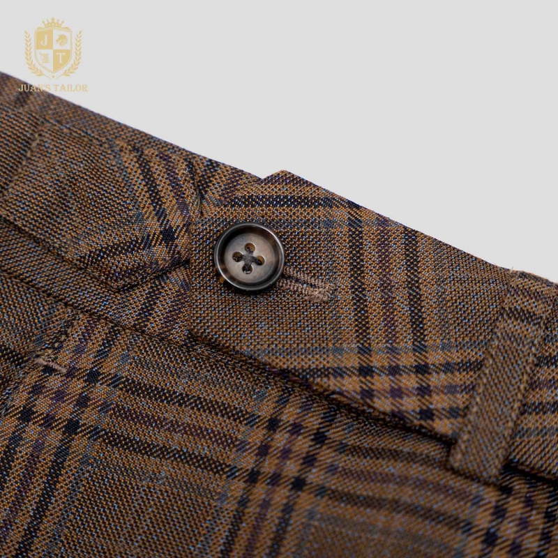- Chiếc quần âu may đo độc bản từ Juan’s Tailor với họa tiết kẻ ô nâu trầm phối sắc kẻ chìm tinh tế, gợi cảm giác ấm áp và gần gũi nhưng vẫn giữ trọn nét sang trọng.