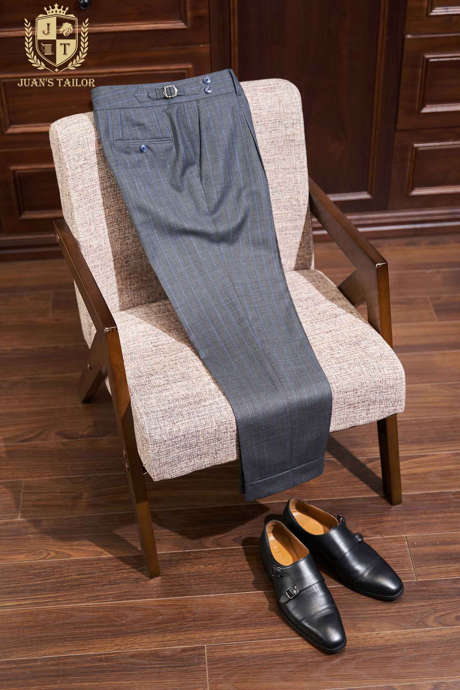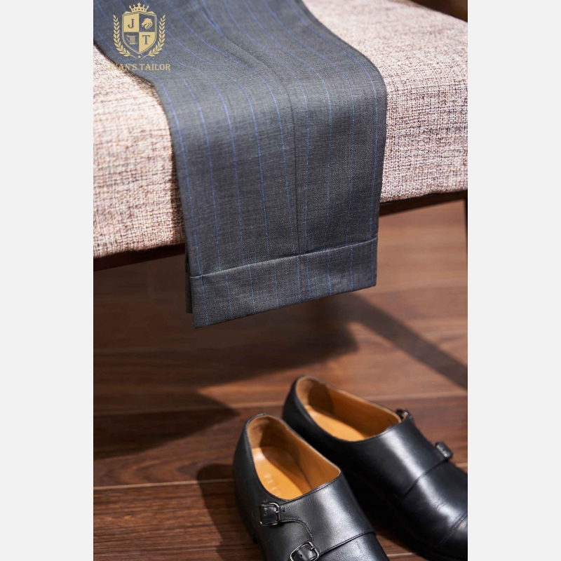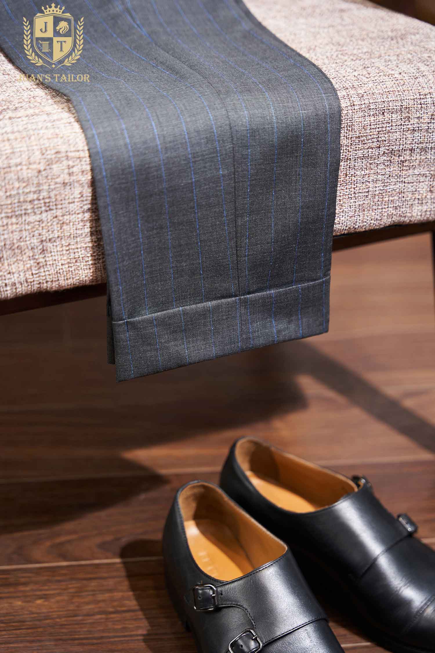 - Đường kẻ pinstripe xanh lam trải dọc thân quần là yếu tố đầu tiên tạo nên dấu ấn. Những sọc mảnh, đều đặn không chỉ giúp đôi chân trở nên thanh thoát hơn mà còn gợi nhắc phong vị cổ điển, vốn là biểu tượng của giới quý ông lịch lãm.