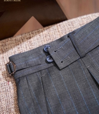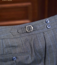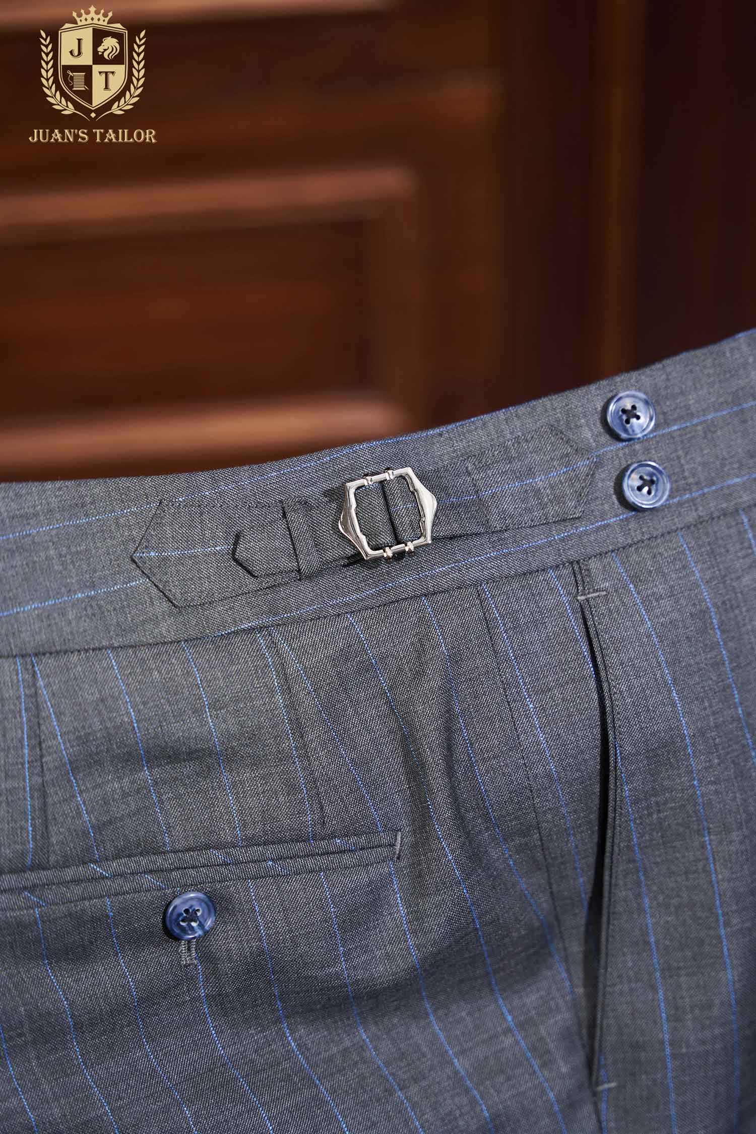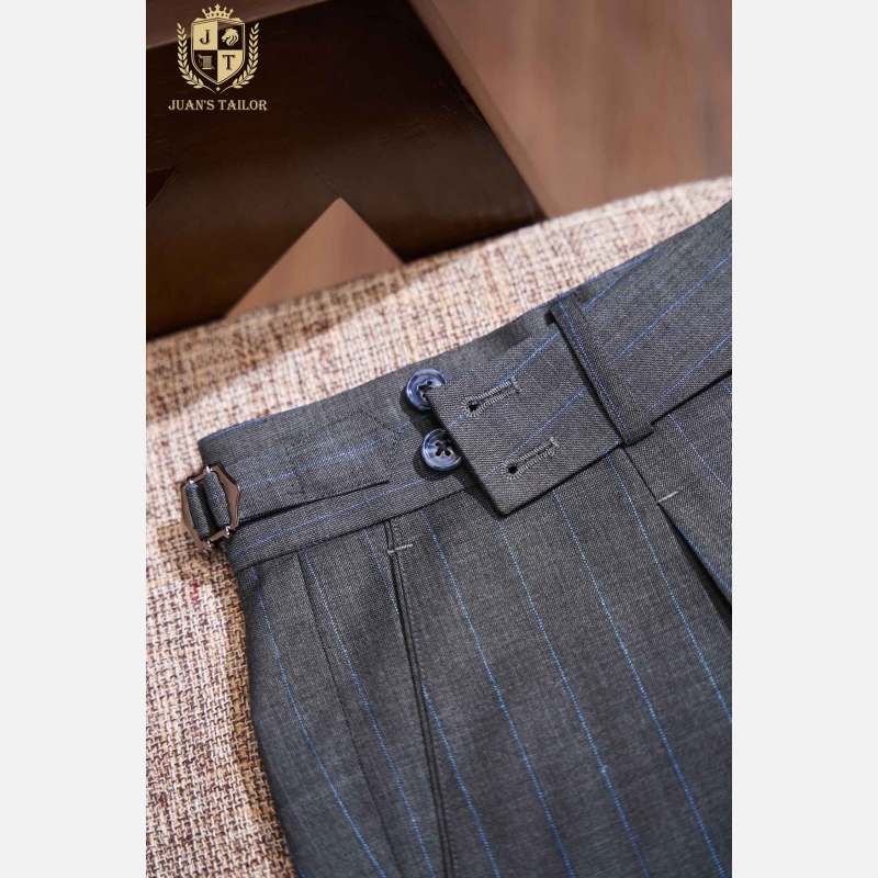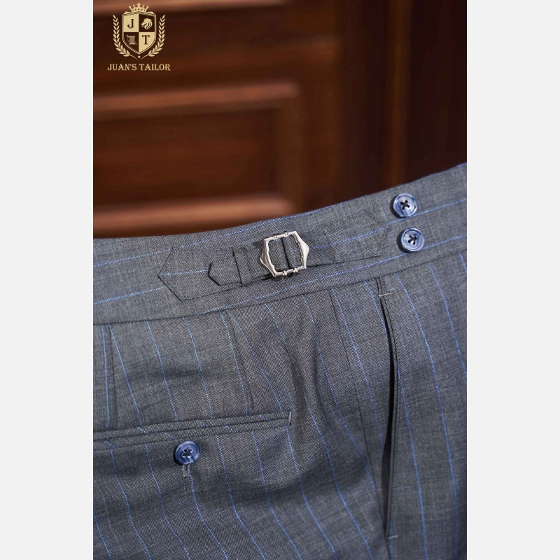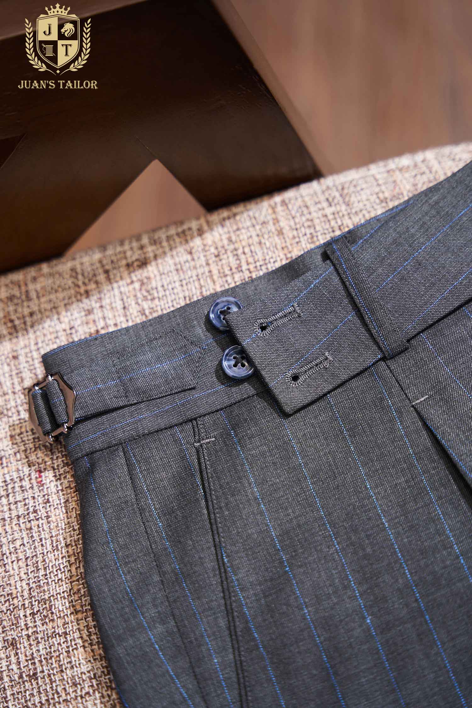 - Đường kẻ pinstripe xanh lam trải dọc thân quần là yếu tố đầu tiên tạo nên dấu ấn. Những sọc mảnh, đều đặn không chỉ giúp đôi chân trở nên thanh thoát hơn mà còn gợi nhắc phong vị cổ điển, vốn là biểu tượng của giới quý ông lịch lãm.