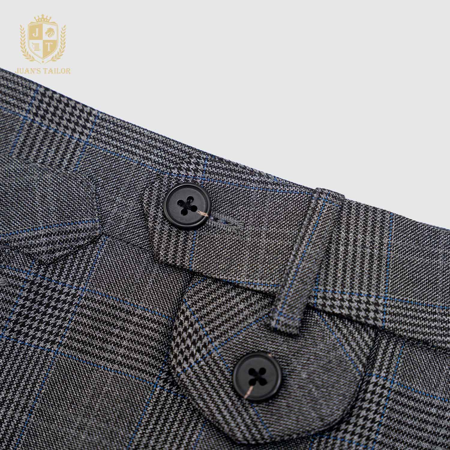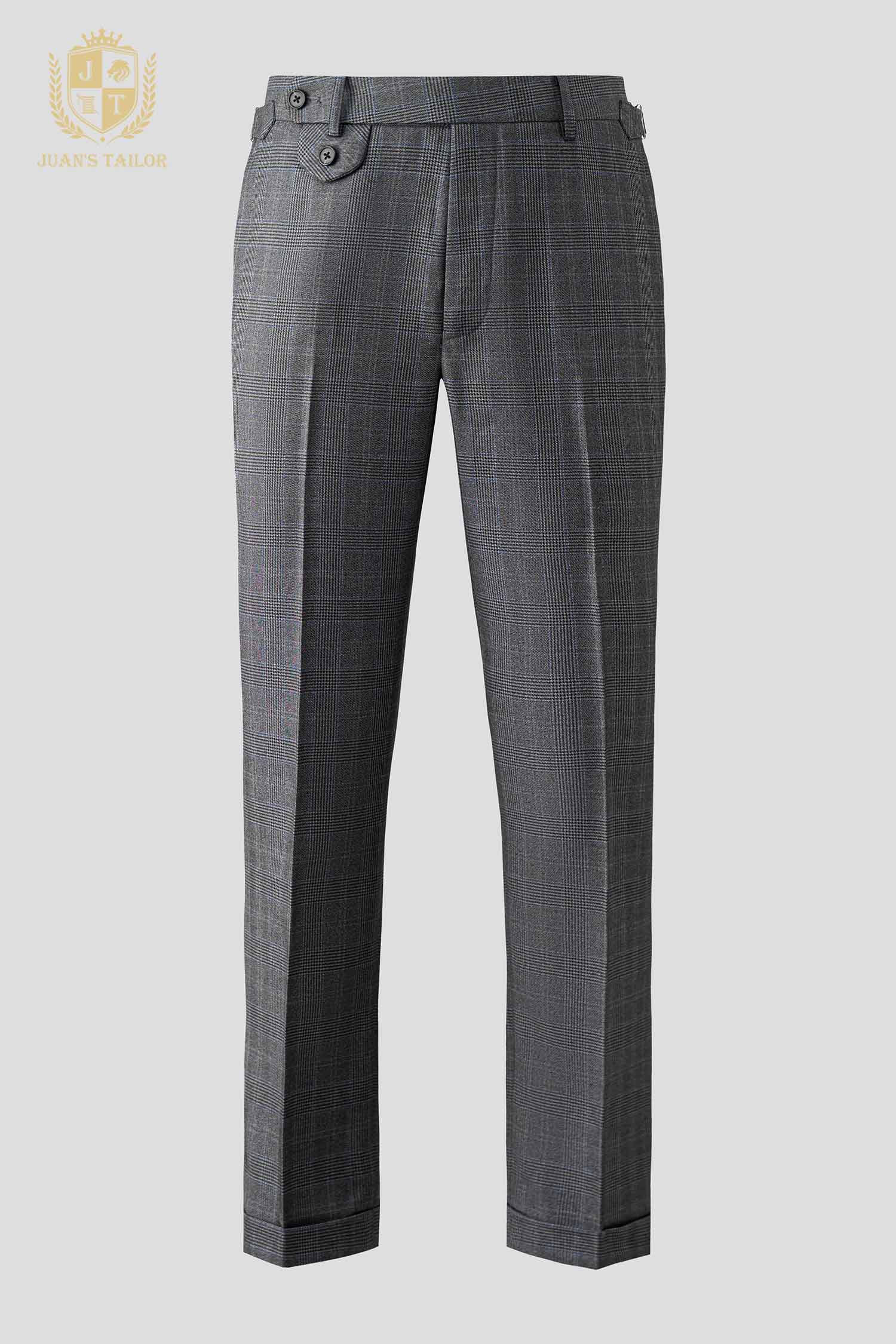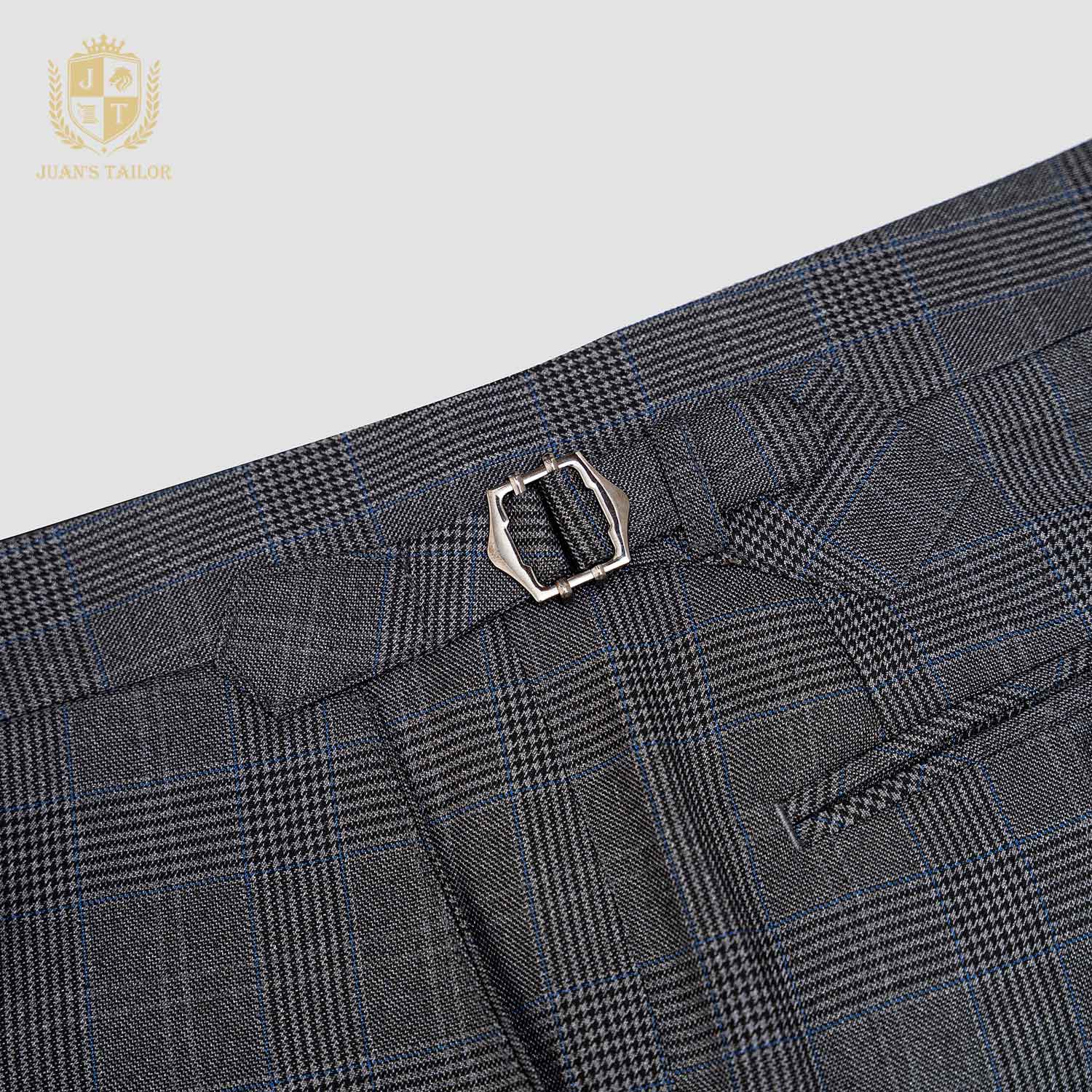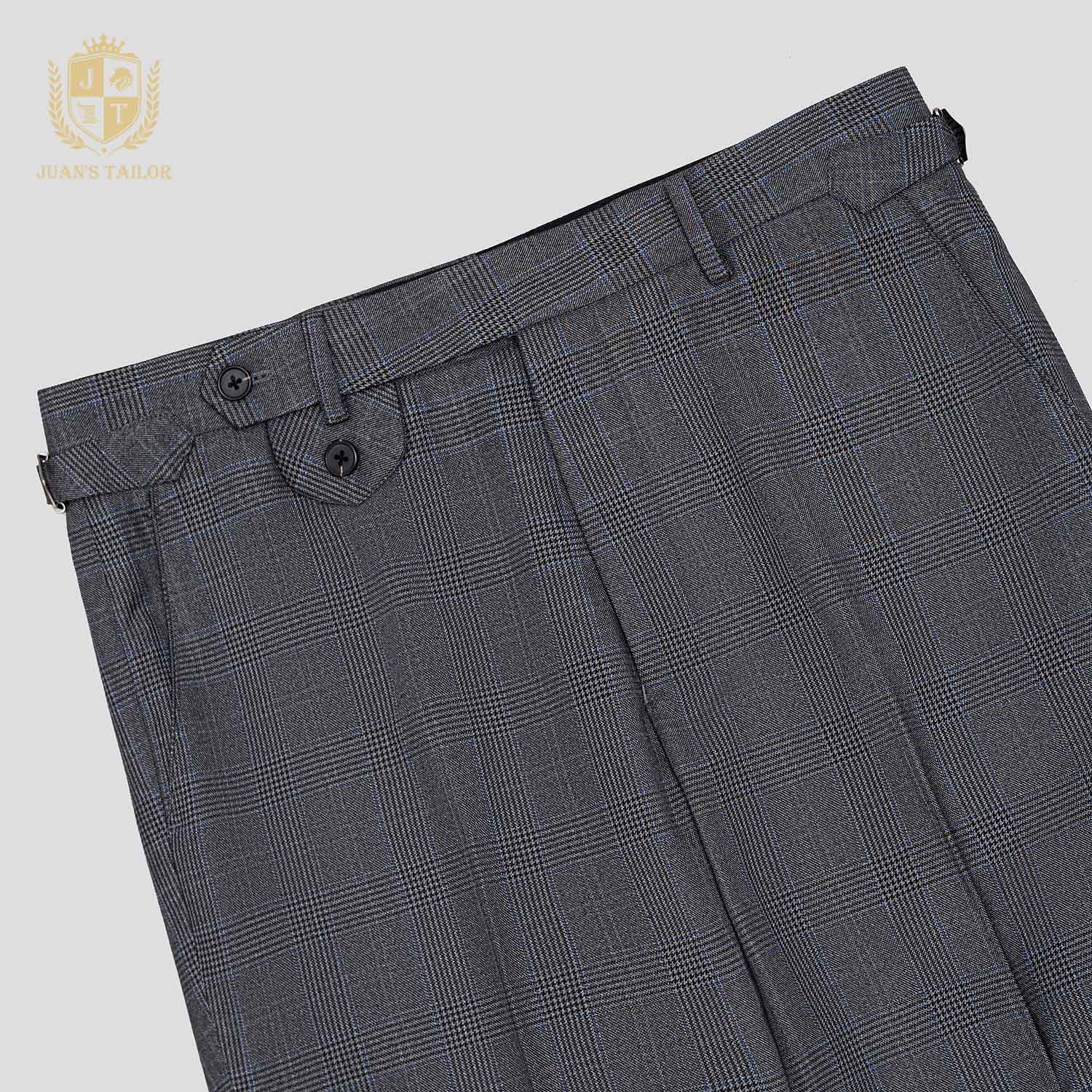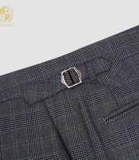 Chiếc quần âu may đo từ Juan’s Tailor nổi bật với họa tiết Prince of Wales kinh điển trên nền xám trung tính, điểm nhấn là những đường kẻ xanh navy mảnh mai, khéo léo như dấu chấm phá của sự hiện đại.