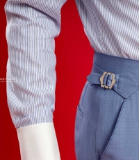 Side-tab nhỏ gọn với nút điều chỉnh bằng kim loại tinh tế. Thay vì dùng thắt lưng có phần quá nghiêm trang, ít tinh tế hơn thì bạn thật dễ dàng điều chỉnh cho cạp quần ôm kín vào vòng eo chỉ với vài thao tác nhỏ. Phần quai-nhê kéo dài về bên phải, kết hợp với khuy màu xanh đậm hài hòa càng làm cho dáng quần thêm chắc chắn.