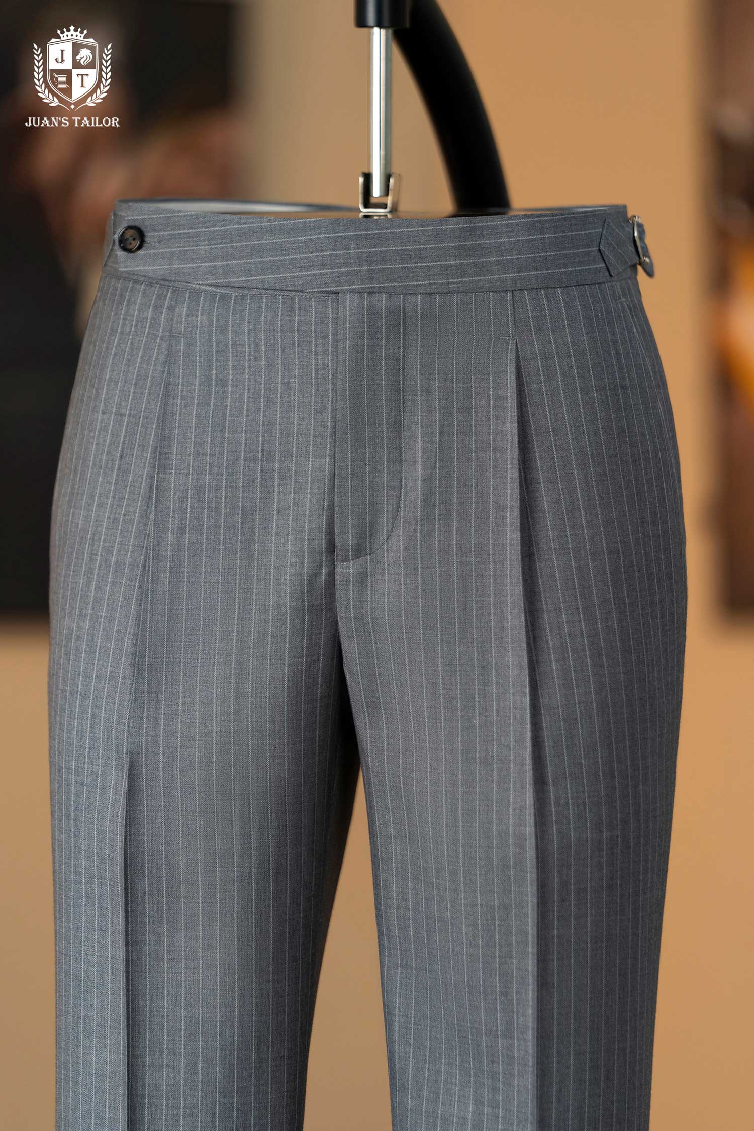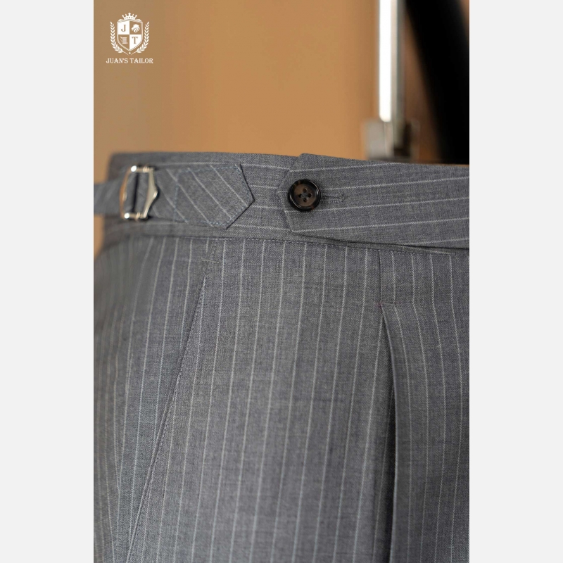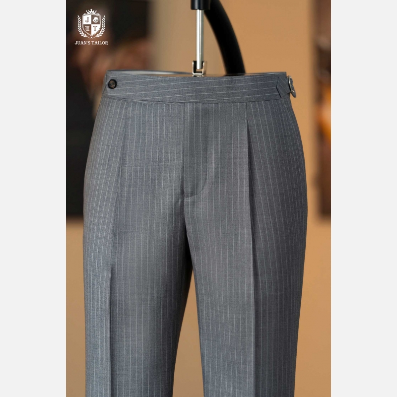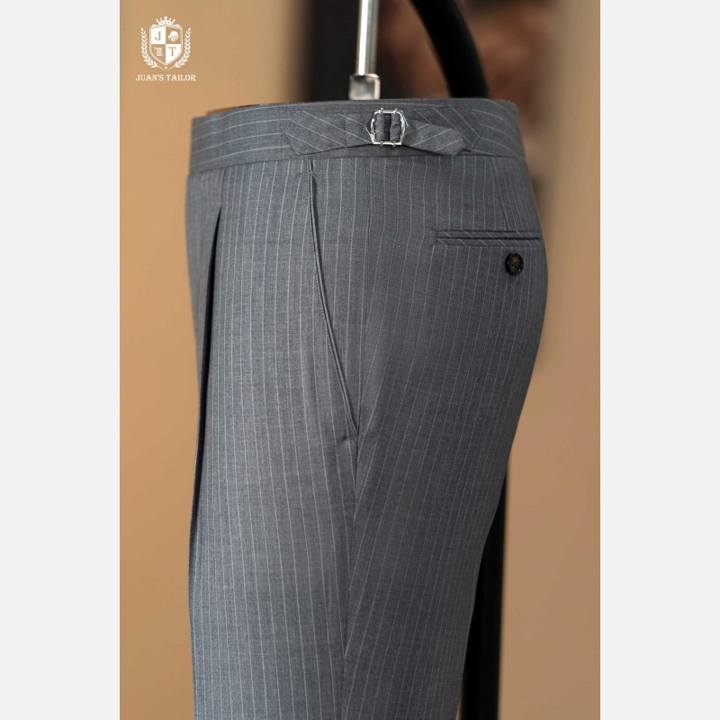 - Mẫu quần âu pinstripe xám mang tinh thần Classic Menswear chuẩn mực – với những đường kẻ dọc mảnh mai giúp tôn dáng và tạo hiệu ứng cao, gọn gàng hơn. Thiết kế được hoàn thiện thủ công cùng phần pleat nhẹ và side tab tinh chỉnh, thể hiện độ tỉ mỉ đặc trưng trong từng sản phẩm của Juan’s Tailor.