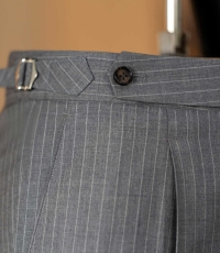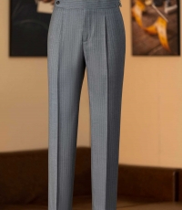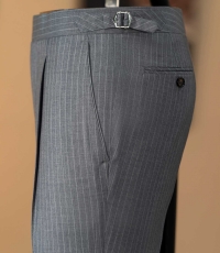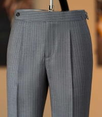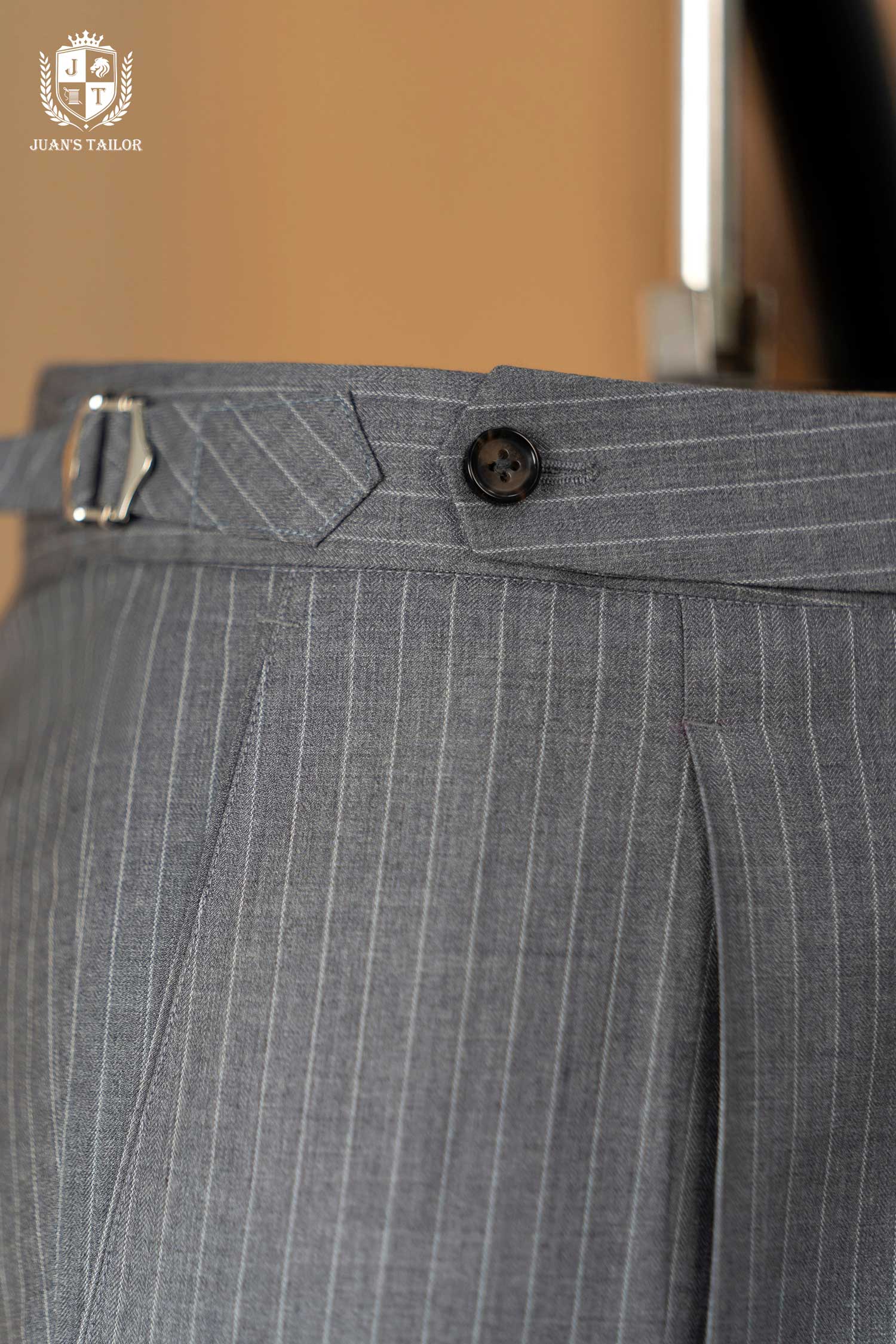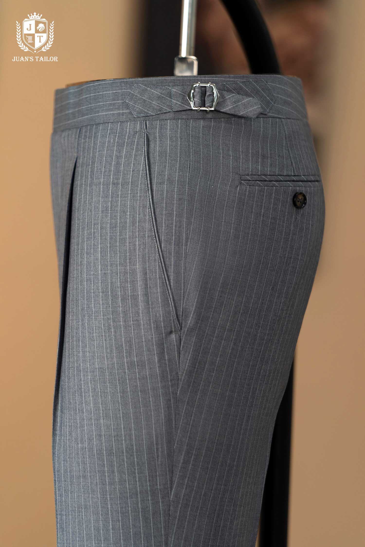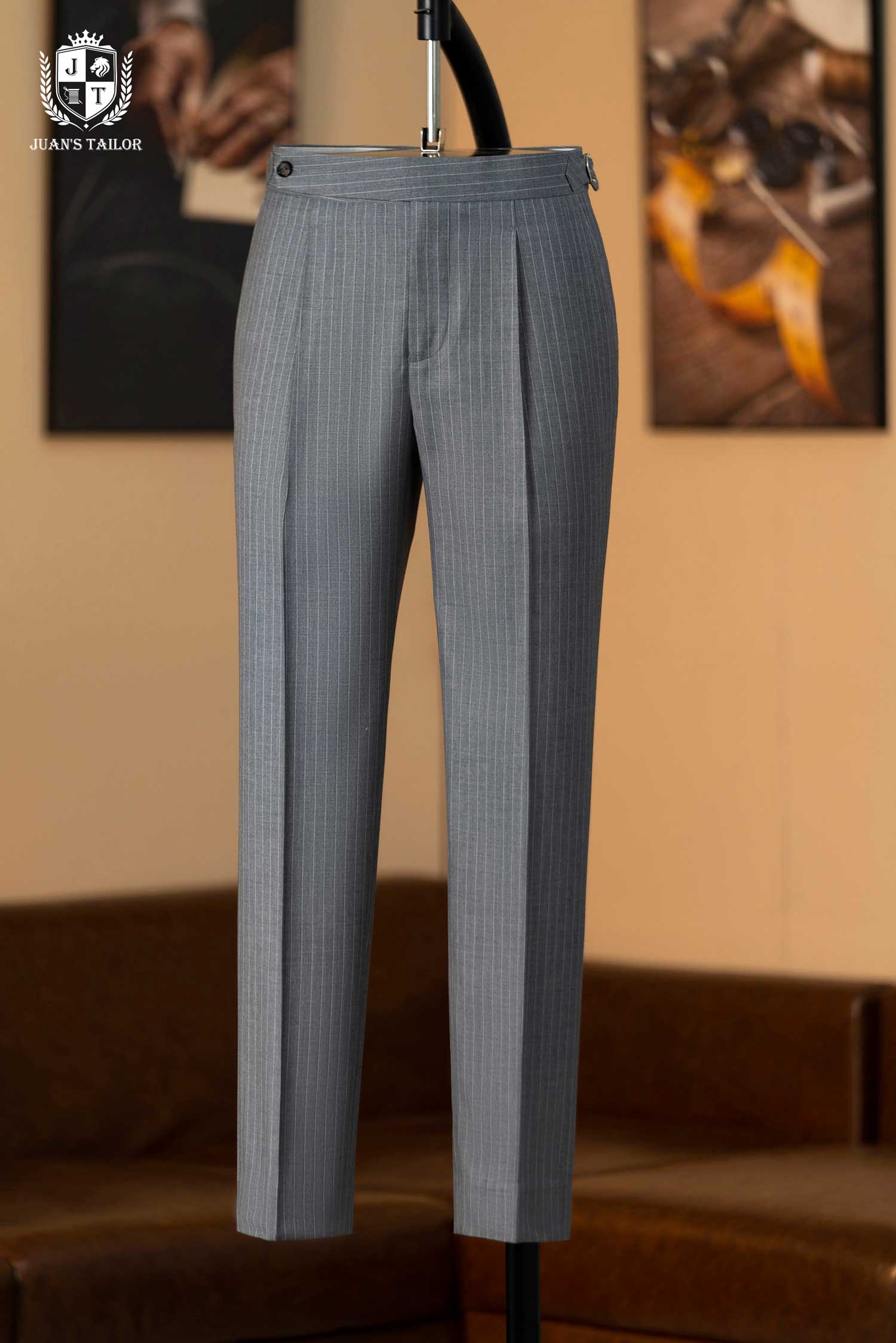 - Mẫu quần âu pinstripe xám mang tinh thần Classic Menswear chuẩn mực – với những đường kẻ dọc mảnh mai giúp tôn dáng và tạo hiệu ứng cao, gọn gàng hơn. Thiết kế được hoàn thiện thủ công cùng phần pleat nhẹ và side tab tinh chỉnh, thể hiện độ tỉ mỉ đặc trưng trong từng sản phẩm của Juan’s Tailor.