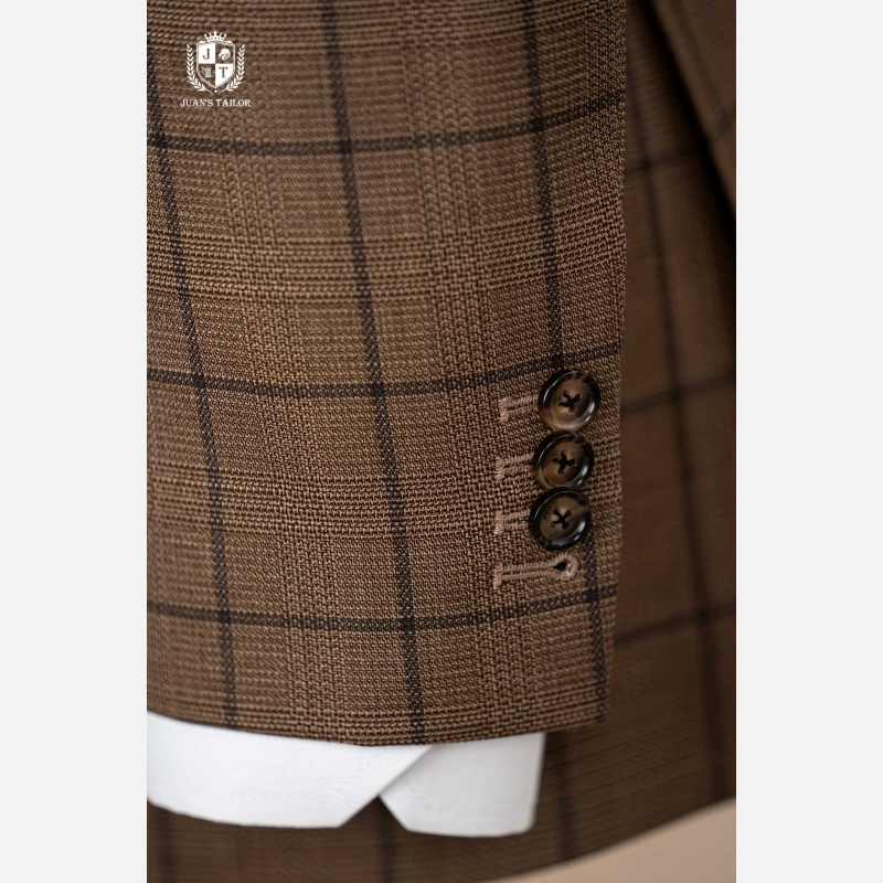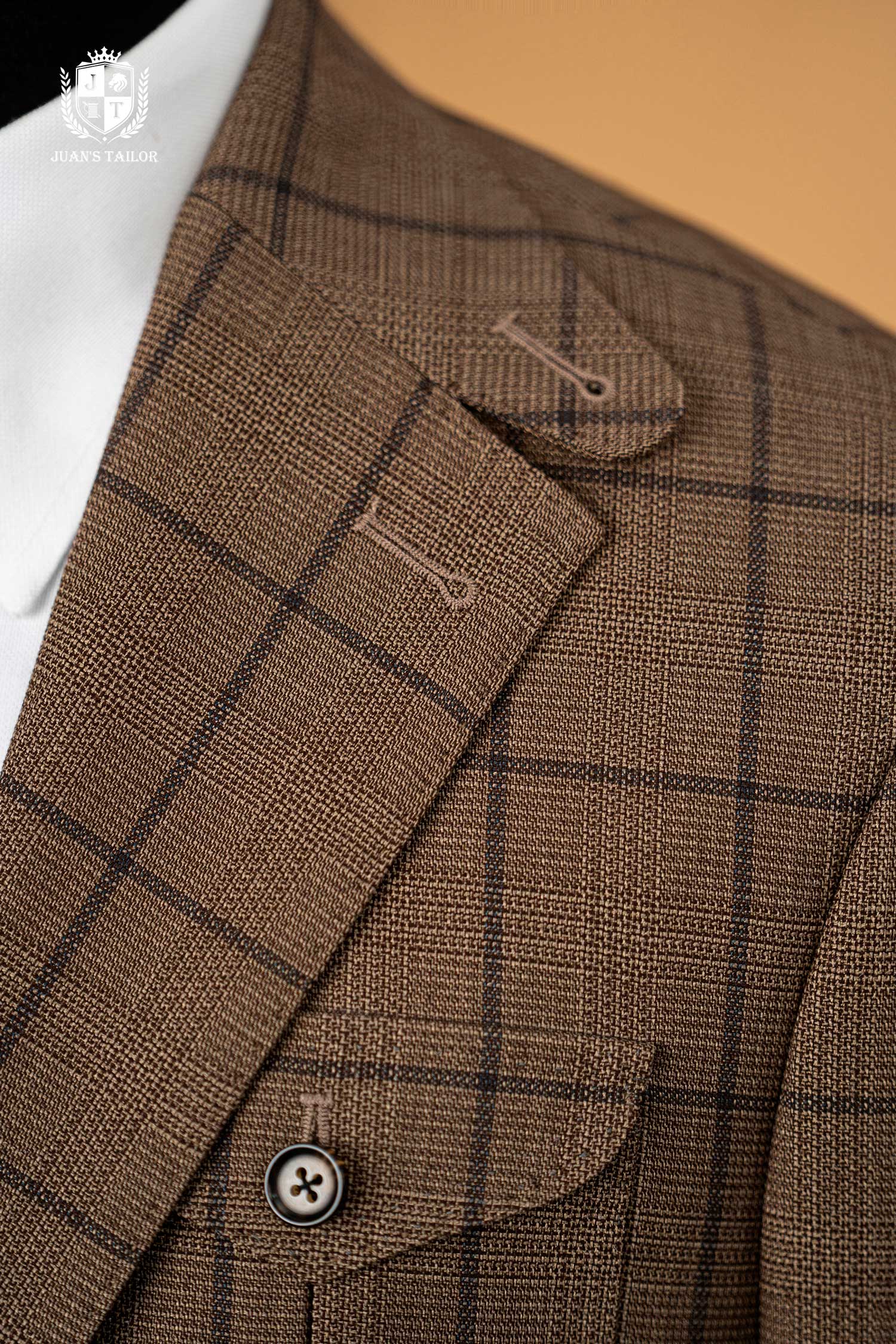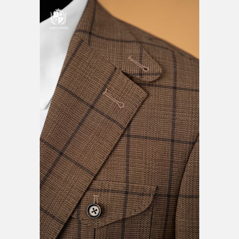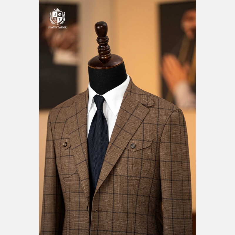 Chiếc blazer nâu caro này dành cho những quý ông yêu sự phóng khoáng nhưng vẫn muốn giữ vẻ lịch thiệp. Nền nâu trầm kết hợp caro lớn tạo cảm giác trưởng thành, trong khi bề mặt vải dệt nổi mang lại chiều sâu và sự sang trọng khi nhìn gần.