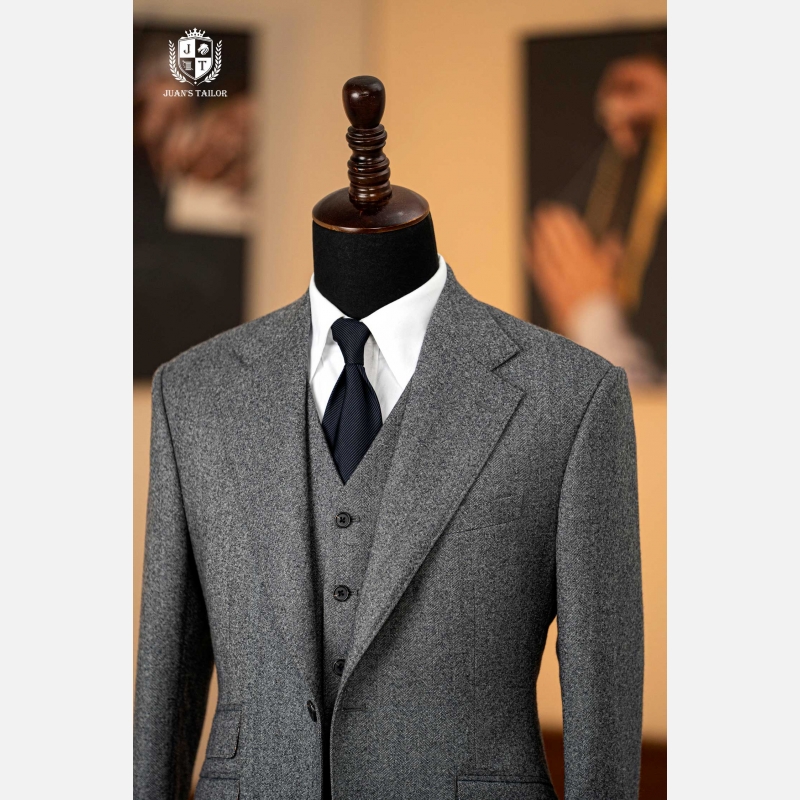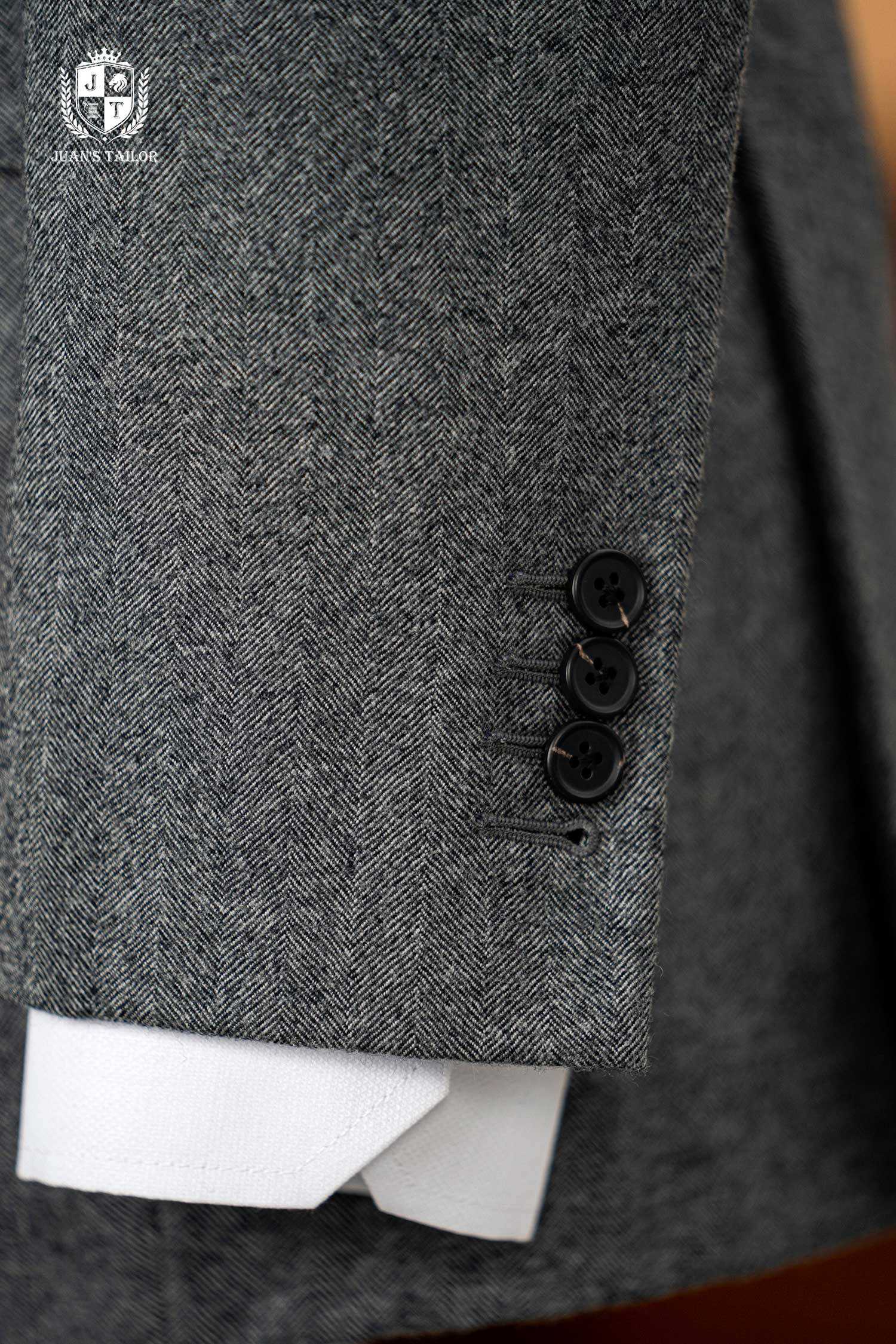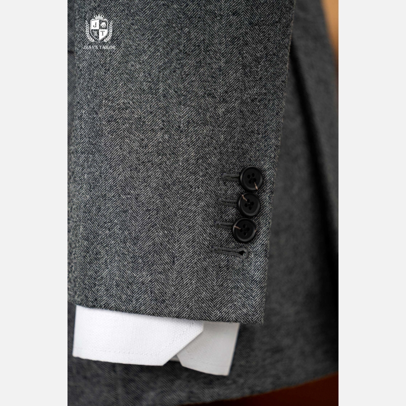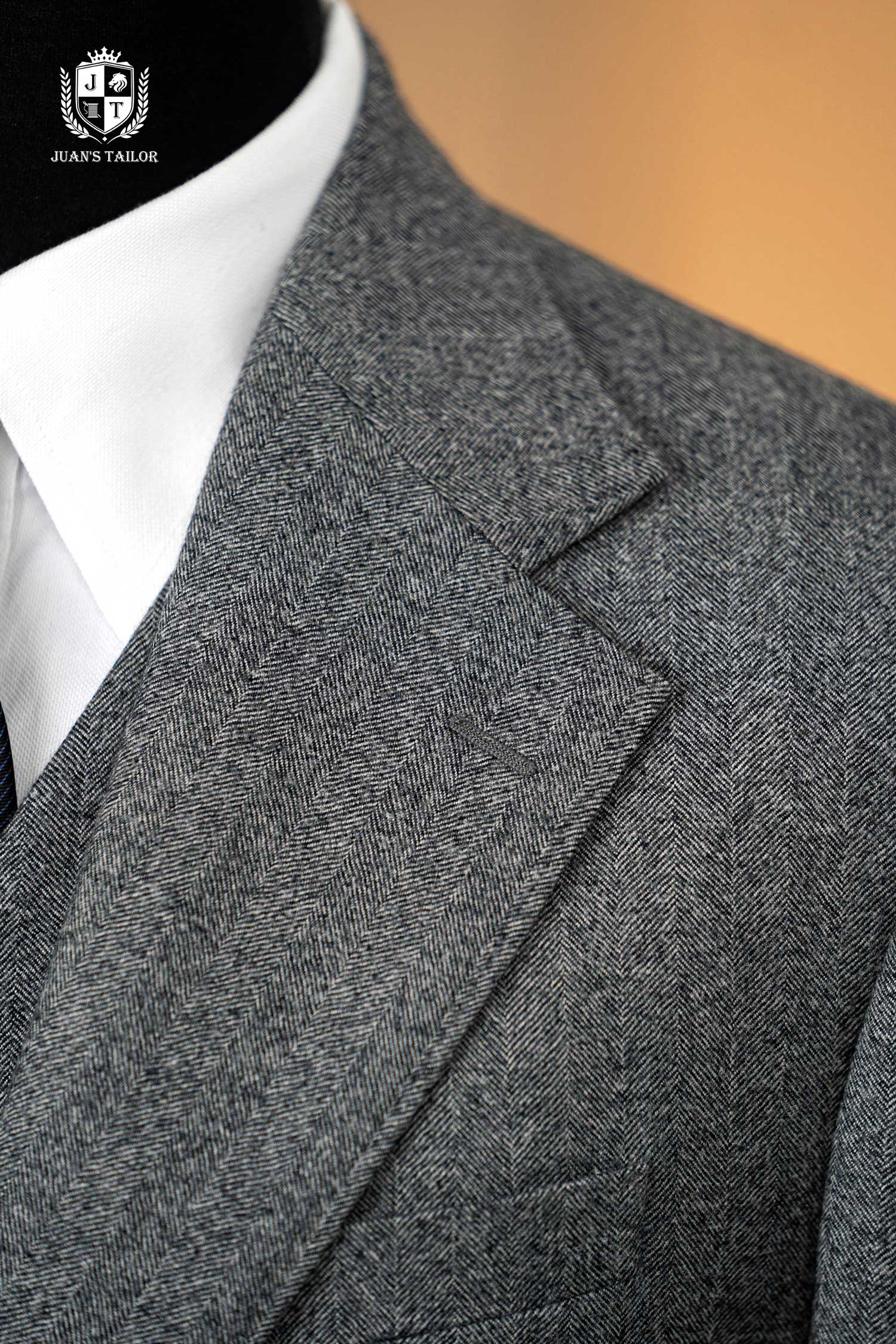 - Quý ông chia sẻ rằng công việc đòi hỏi phải di chuyển nhiều, nên anh cần một bộ suit 3 mảnh vừa ấm áp, vừa thoải mái. Dựa trên những yêu cầu đó, tiệm chọn flannel wool 100% len - chất liệu nổi tiếng với bề mặt được chải nhẹ, tạo lớp “nap” mịn giúp giữ nhiệt tốt hơn so với các dòng wool thông thường. Flannel còn mang lại cảm giác mềm mịn, khả năng giữ ấm tự nhiên và độ đứng form vượt trội. Một chi tiết đáng chú ý hơn đó là họa tiết xương cá (Herringbone) được dệt từ những đường chéo đan ngược, tạo chiều sâu rõ nét khi nhìn gần và mang lại vẻ lịch thiệp gọn gàng khi nhìn tổng thể.