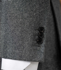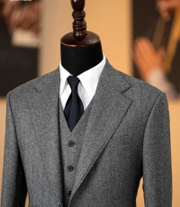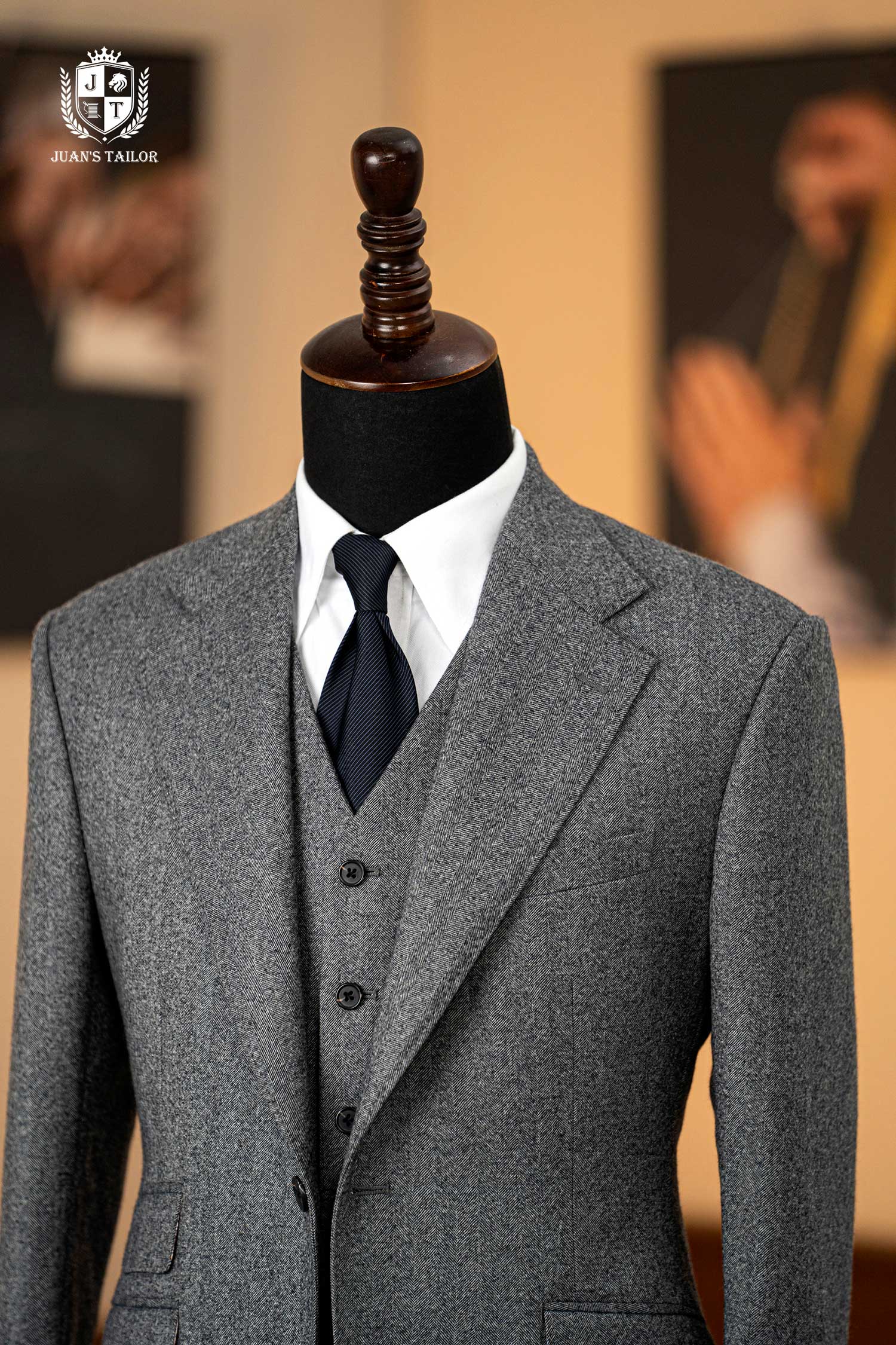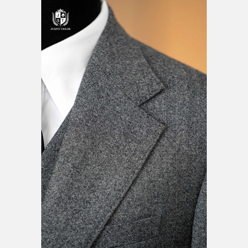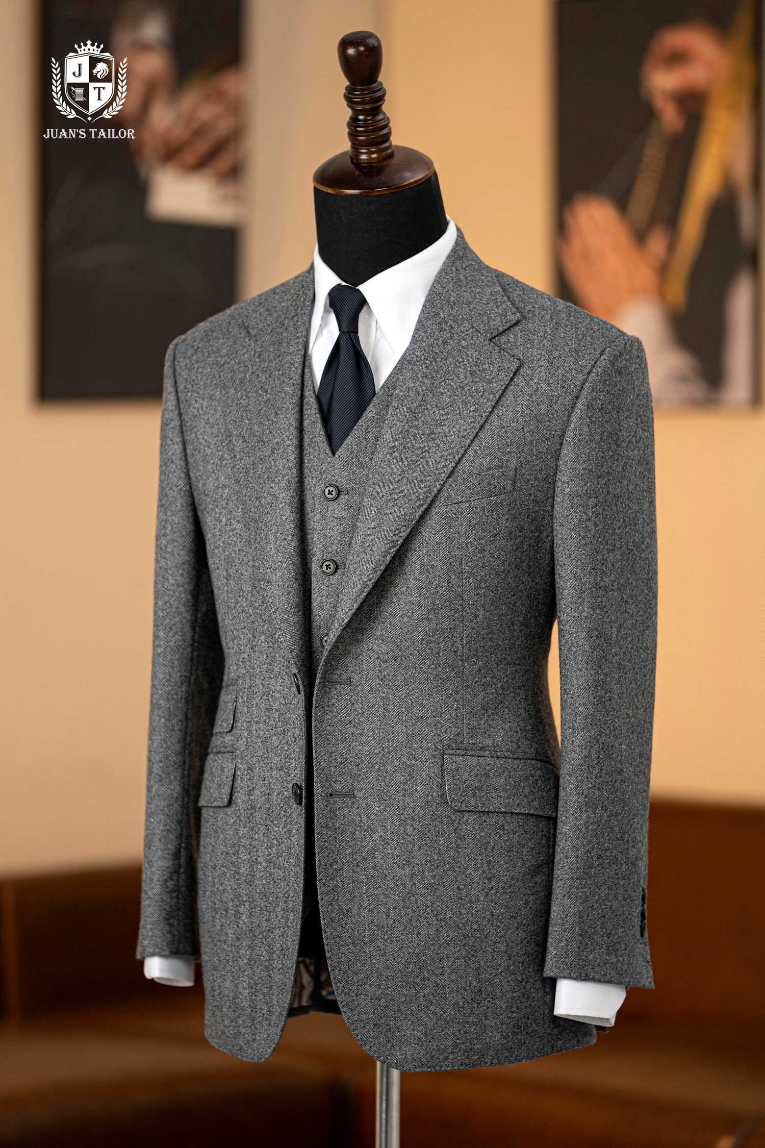- Quý ông chia sẻ rằng công việc đòi hỏi phải di chuyển nhiều, nên anh cần một bộ suit 3 mảnh vừa ấm áp, vừa thoải mái. Dựa trên những yêu cầu đó, tiệm chọn flannel wool 100% len - chất liệu nổi tiếng với bề mặt được chải nhẹ, tạo lớp “nap” mịn giúp giữ nhiệt tốt hơn so với các dòng wool thông thường. Flannel còn mang lại cảm giác mềm mịn, khả năng giữ ấm tự nhiên và độ đứng form vượt trội. Một chi tiết đáng chú ý hơn đó là họa tiết xương cá (Herringbone) được dệt từ những đường chéo đan ngược, tạo chiều sâu rõ nét khi nhìn gần và mang lại vẻ lịch thiệp gọn gàng khi nhìn tổng thể.