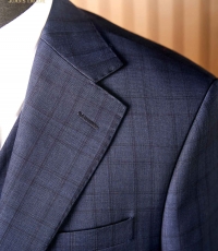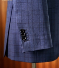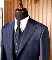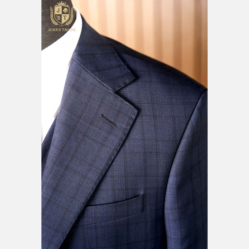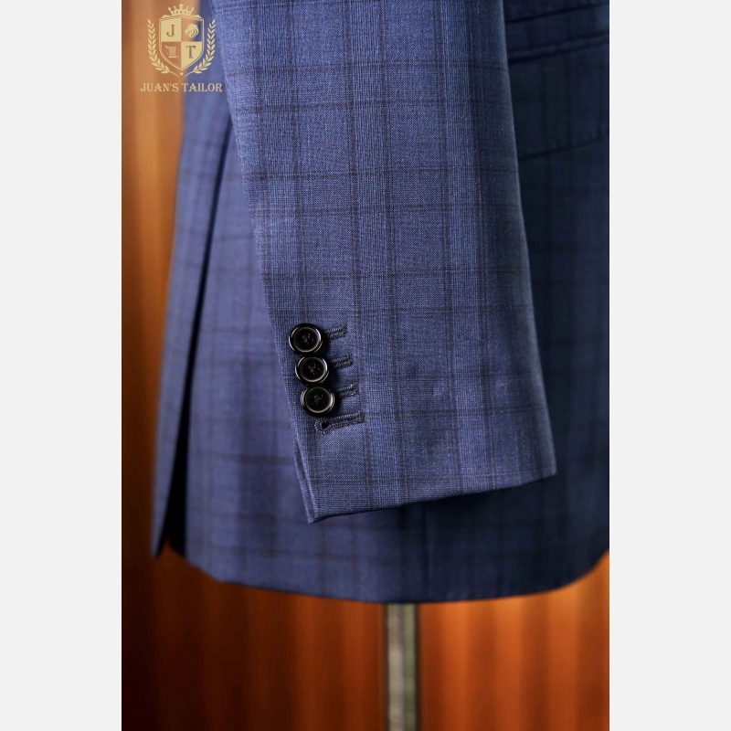 - Vải wool cao cấp được dệt thủ công với khả năng thoáng khí và giữ nếp vượt trội, mang lại cảm giác thoải mái nhưng vẫn duy trì phom dáng cứng cáp. Đường kẻ windowpane được xử lý khéo léo để chỉ xuất hiện như một lớp ánh sáng nhẹ trên nền vải xanh, vừa hiện đại vừa cổ điển.