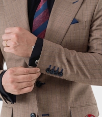Điểm nổi bật của sản phẩm khác biệt với nhiều sản phẩm khác là màu nâu vàng kết hợp với các đường kẻ nhỏ. Sự pha trộn này tạo nên một tổng thể mới mẻ, hiện đại. Khuy áo màu navy càng nổi bật hơn trên nền màu của bộ suit.