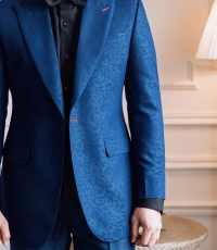 Điểm nổi bật nhất của sản phẩm chính là chất liệu và họa tiết vải được sử dụng. Bộ suit màu xanh với họa tiết in hoa chìm trên vải độc đáo. Tạo hiệu ứng nổi bật thu hút ánh nhìn. Đường may các ô cài khuy áo màu nỏ, trên nền xanh lại càng nổi bật hơn. Chất liệu vải cao cấp, hơi bóng nhẹ. Khi kết hợp với áo sơ mi và nơ đen sẽ mang lại một tổng thể chỉn chu, sang trọng.Suit xanh dương đậm với họa tiết hoa văn in chìm độc đáo